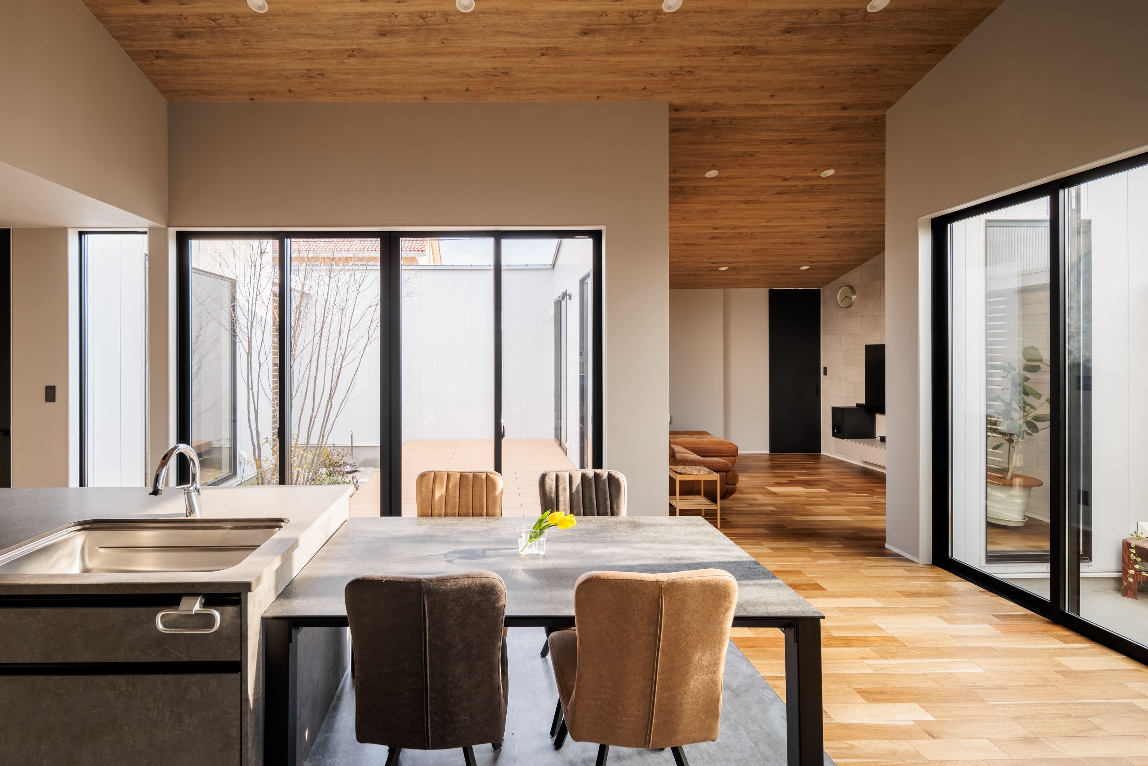 圧倒的な解放感を得るため、思いきってLDKを分断し、中庭を2ヶ所、風呂坪庭1ヶ所、リビングに吹抜を採用しました。室内全てのステージから決して飽きることがない、想像を超える視線の向け方を配慮した室内空間です。